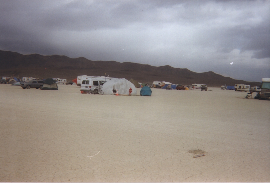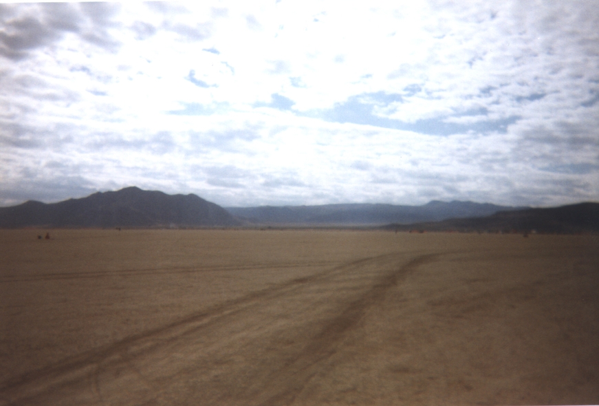 On Sunday, September 3, 2000, I watched the sun rise while I was sitting outside our tent in the place that is temporarily Black Rock City, Nevada every year. Hours before, the Man had been burnt, and I had spent the rest of the night exploring the amazing art in the "city". The sun cast its orange rays on the clouds causing them to shimmer and burst with life. In my purely sleep-deprived state, the shimmering clouds seemed to turn into mermaids that turned into fish that turned into swans that turned into dragons that turned into butterflies that I could almost reach out and touch. Behind me, the Black Rock mountains seemed to form a huge tent and slowly billow over the high desert (or "playa") covering all the tents that comprised Black Rock City. That is just a taste of one of the most surreal and psychedelic experiences I've been through in my life.