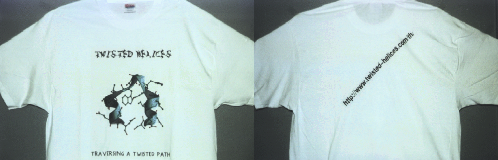 The front of the T-shirt is almost like the CD cover---it contains the TWISTED HELICES logo with the name of the band on top and the name of the album on the bottom. The back of the T-shirt contains the band www page address. The material is 100% cotton and the size is extra-large (XL).
